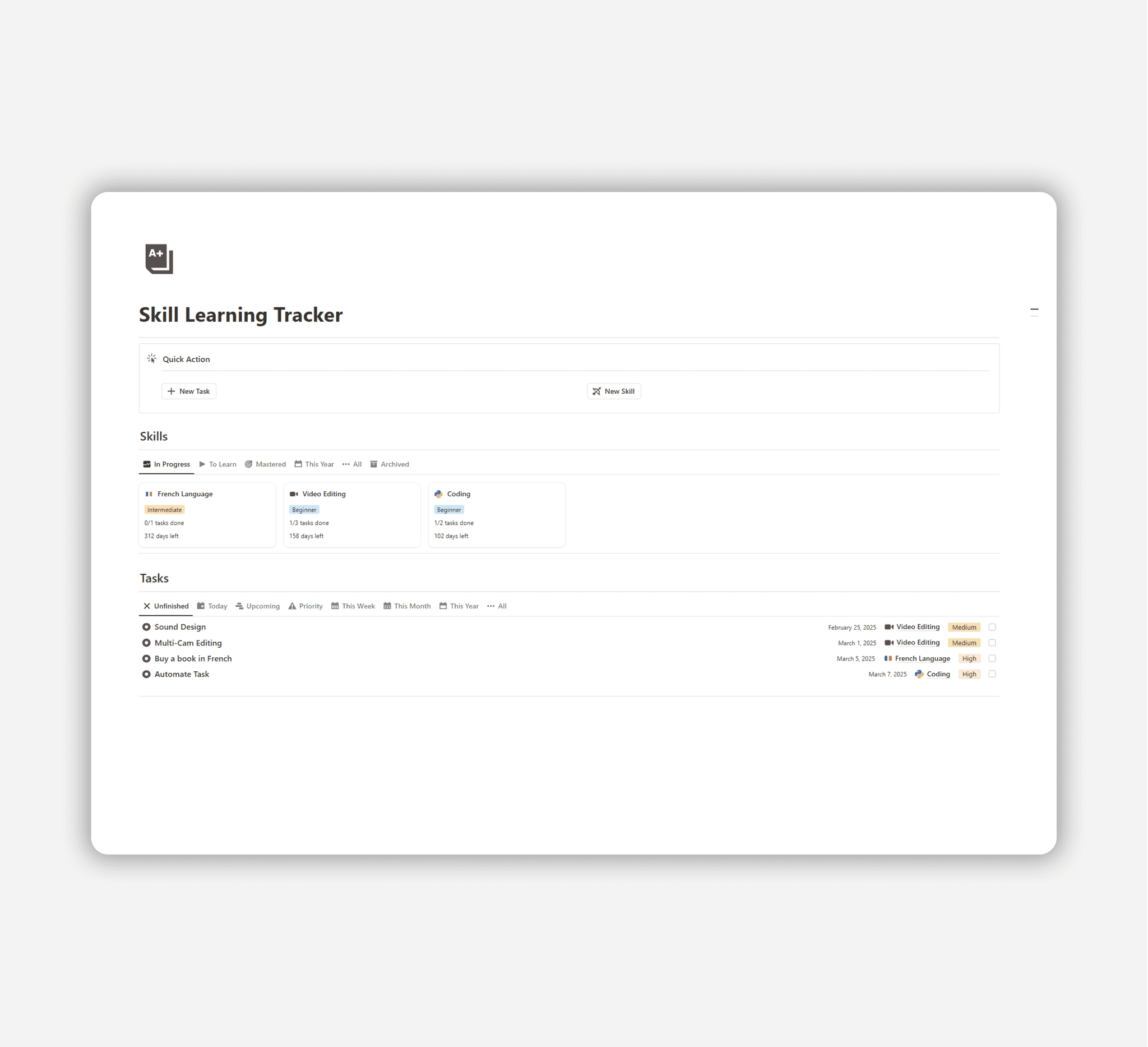 Track, organize, and improve your skill development efficiently.