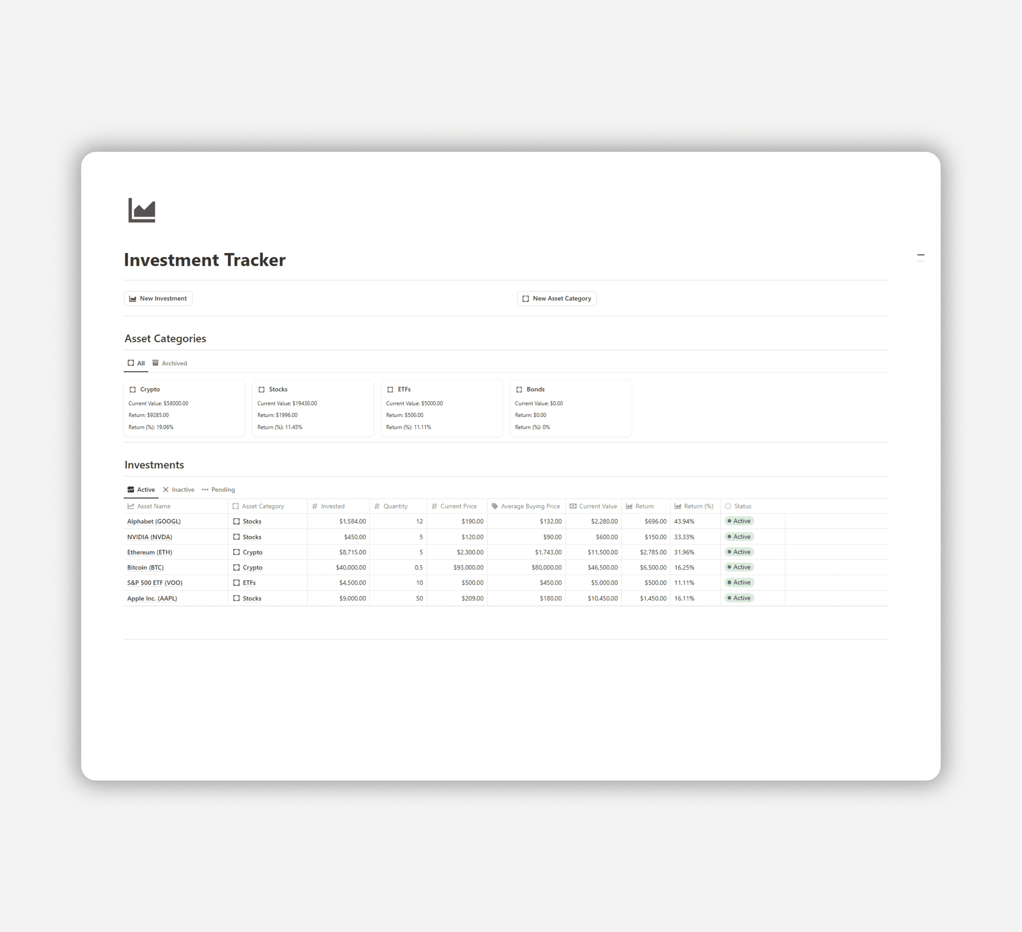 Track and manage investments with analytics and organized categorization.