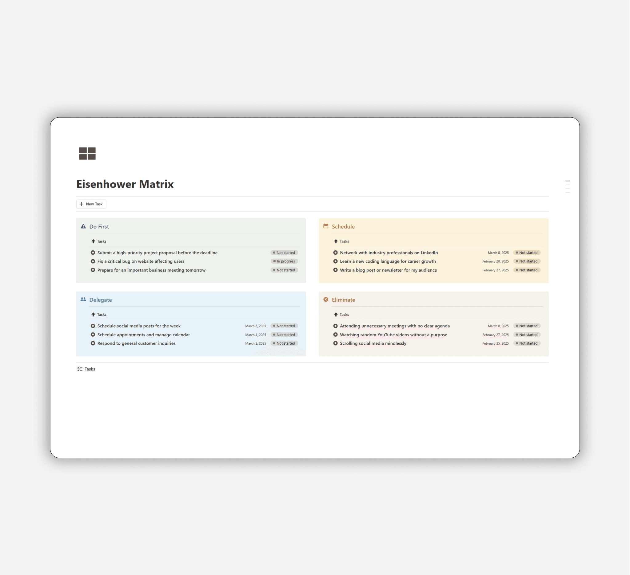 Focus on what truly matters by categorizing tasks based on urgency and importance.