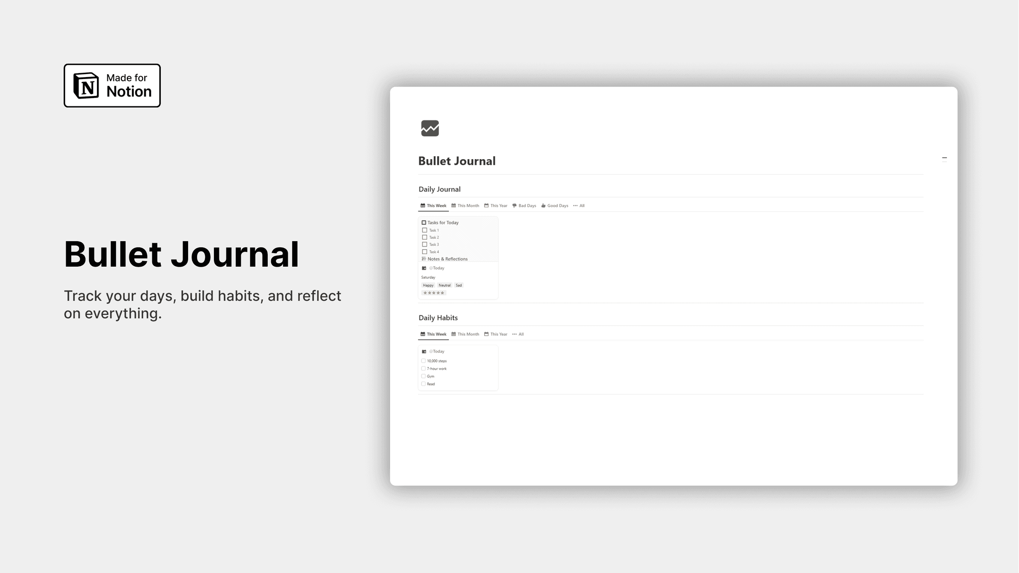 Stay organized and stress-free with this Notion Bullet Journal, designed to help you efficiently manage your daily tasks and track personal habits. Whether you're focusing on productivity or personal growth, this system keeps everything in one place.