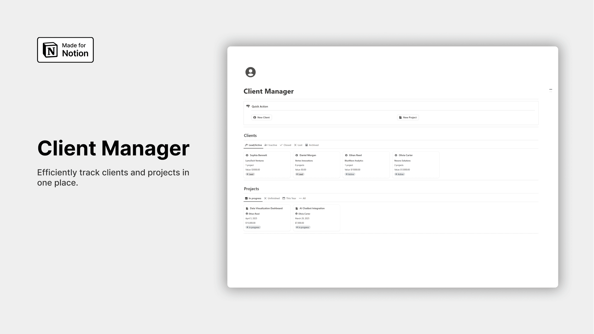 This Client Manager in Notion is designed to efficiently track clients and projects, keeping everything organized in one place.