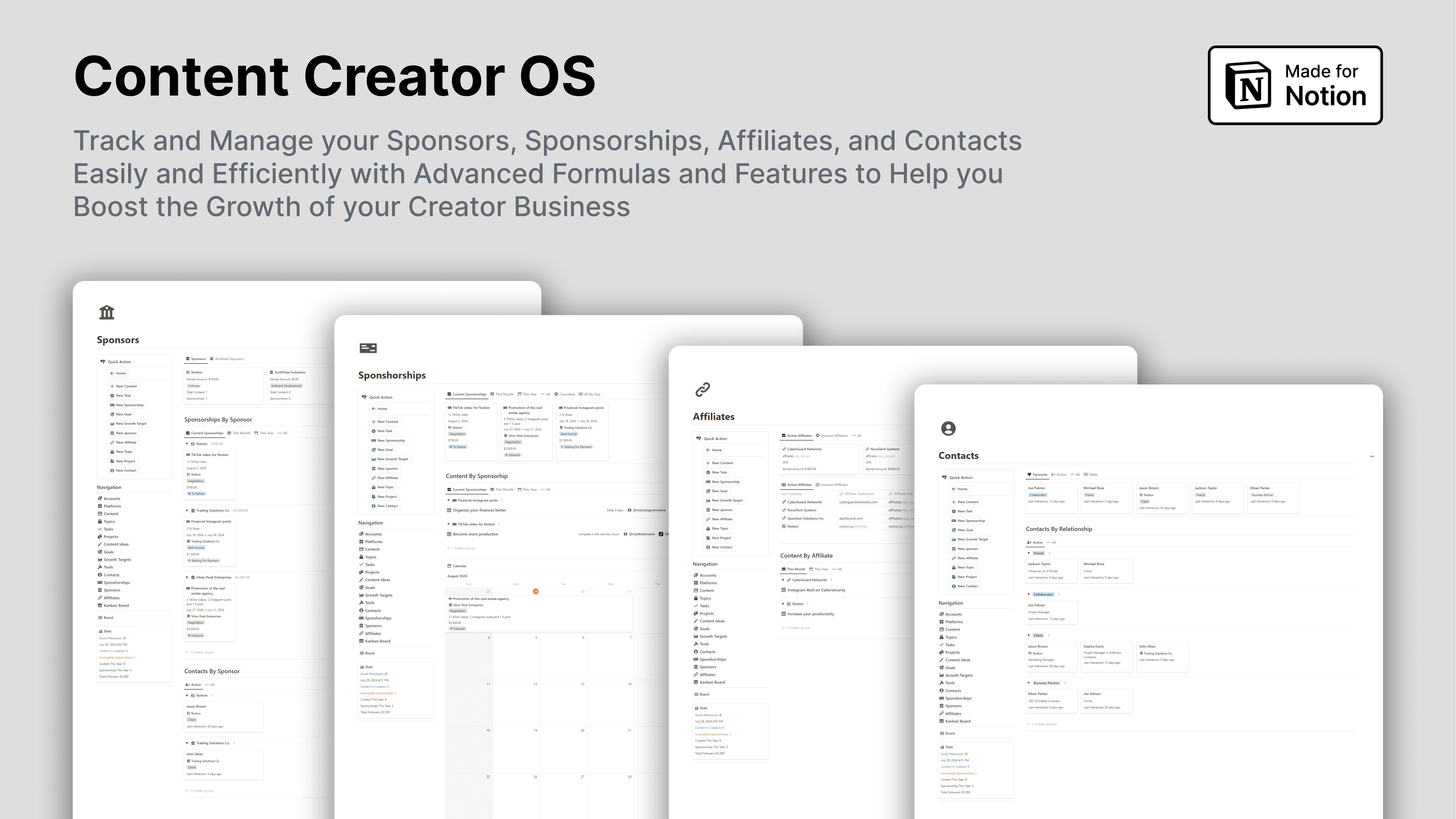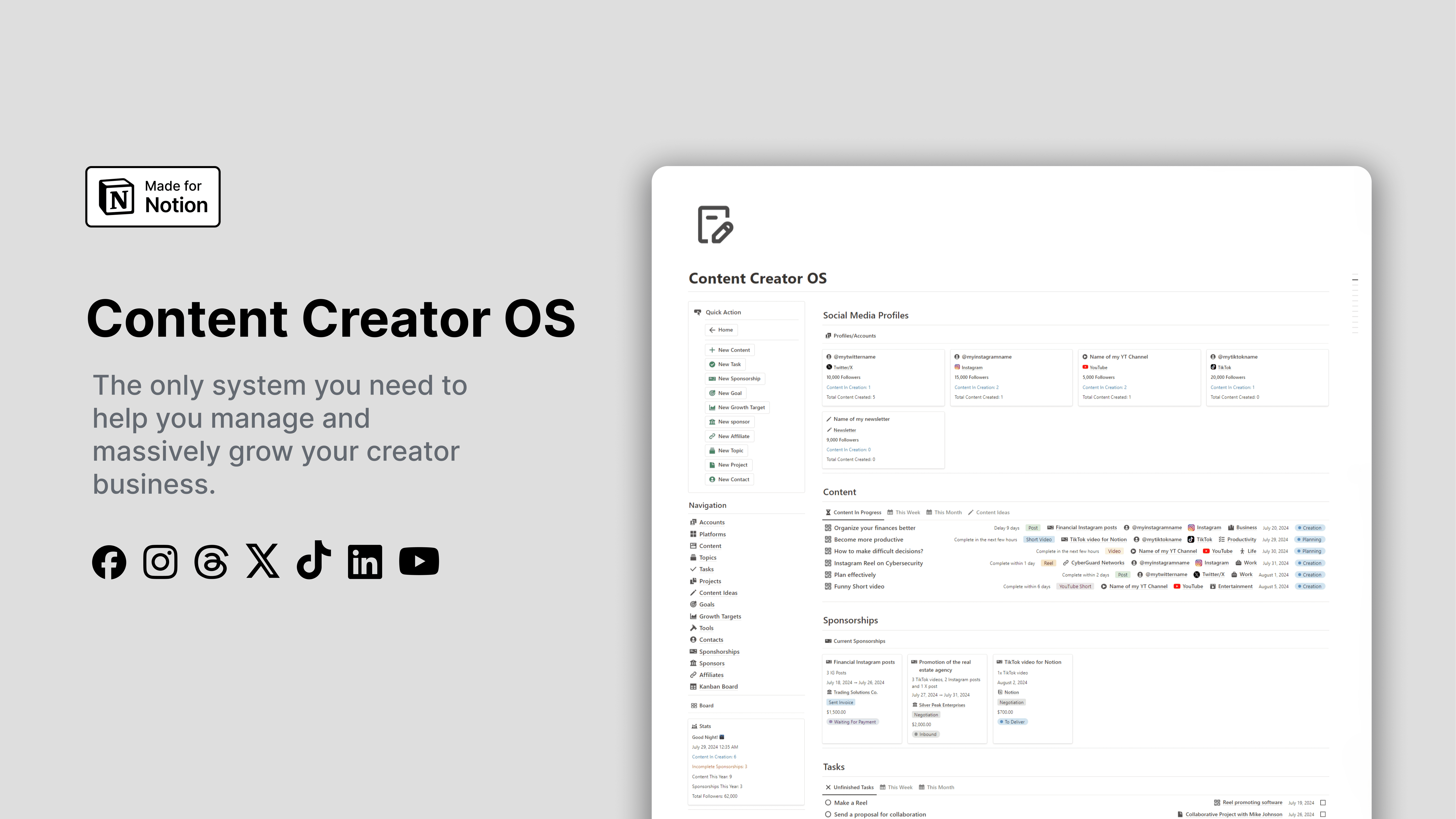 This Content Creator OS will give you more organization and efficiency in content creation and management of your sponsorships, affiliates, projects, etc., so you can quickly create more content with higher quality and boost the growth of your creator business.