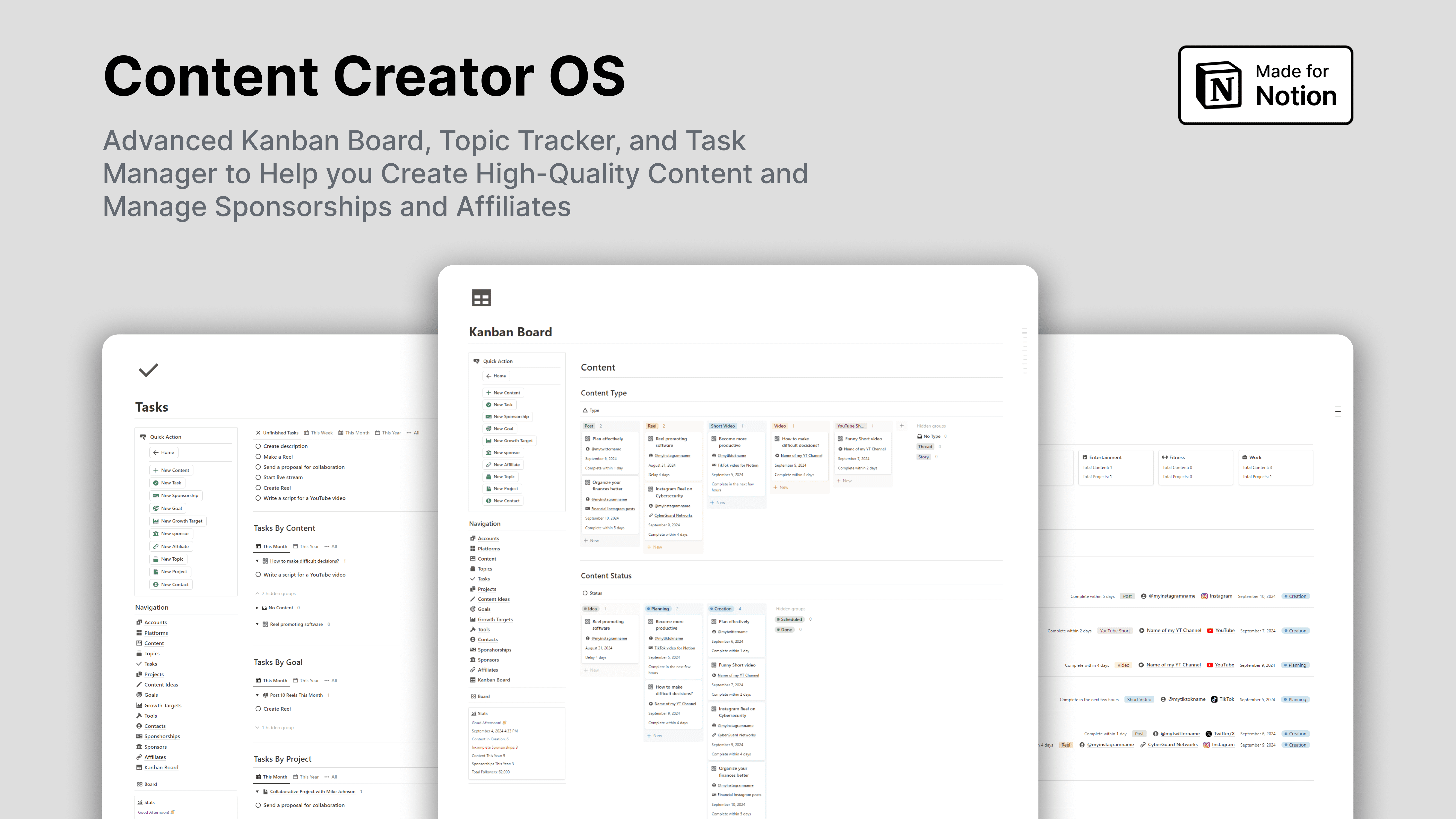 Notion Content Creator OS is a Notion system to help you plan, create, and schedule content, better manage your Social Media profiles, Track and achieve your goals and growth targets, track and manage your projects, tasks, sponsorships, affiliates, sponsors, contacts, related to content creation, track metrics, manage content using Kanban Board, and much more.