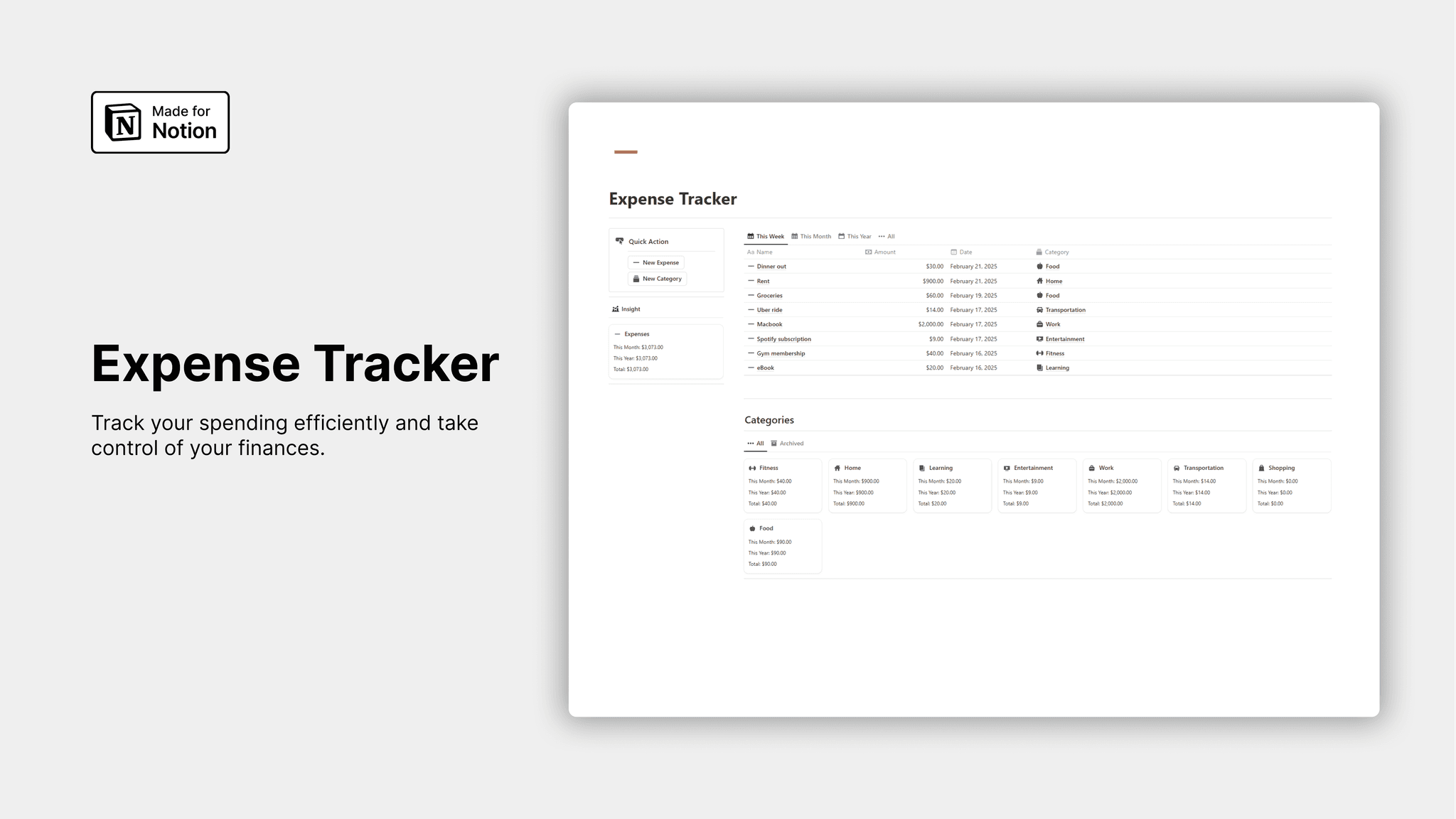 📊 Clear Spending Categories – Organize expenses into categories like Food, Rent, or Entertainment so you know exactly where your money is going.