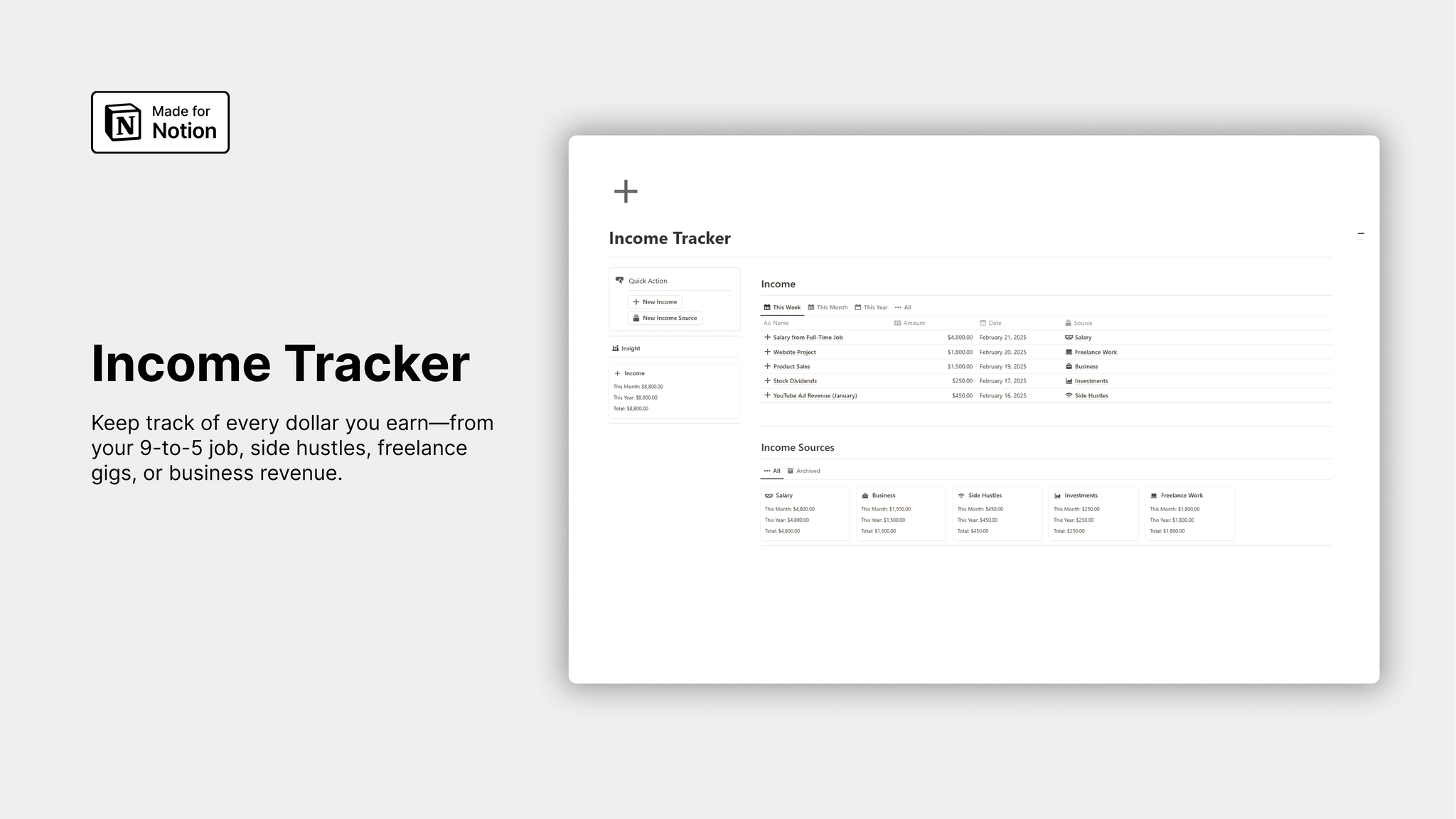 Looking to get your finances in order? The Notion Income Tracker is your new best friend for keeping tabs on all your money moves. This template helps you log every penny coming in – your regular paycheck, side hustle earnings, or that random Venmo from your friend who finally paid you back for lunch.