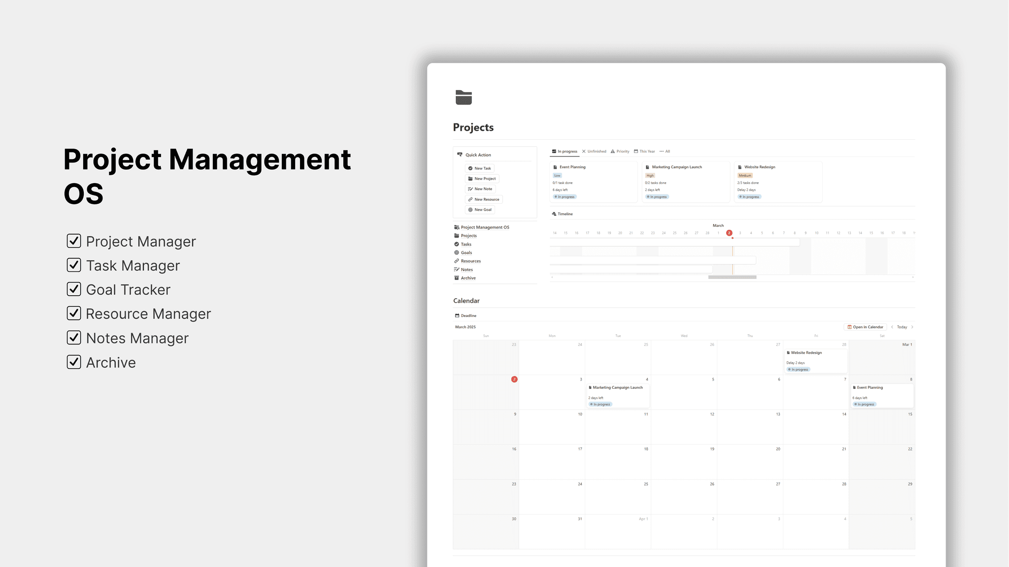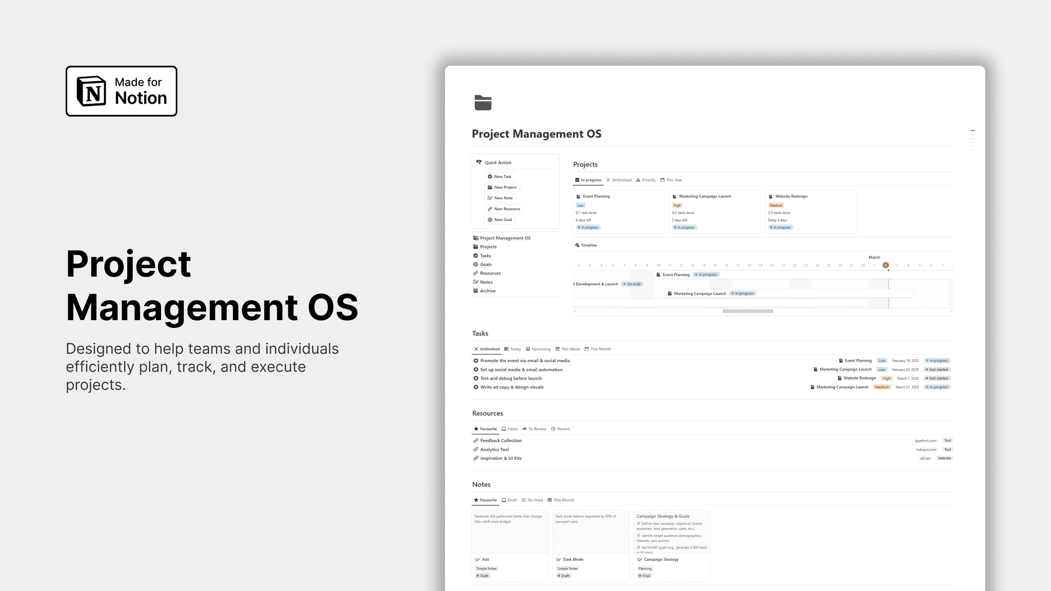 With a ready-to-use Notion System, the Project Management OS makes it easy to keep your projects on track from start to finish. Whether you're revamping a website, launching a marketing campaign, or building a new product, this hub keeps everything organized, transparent, and easy to manage.