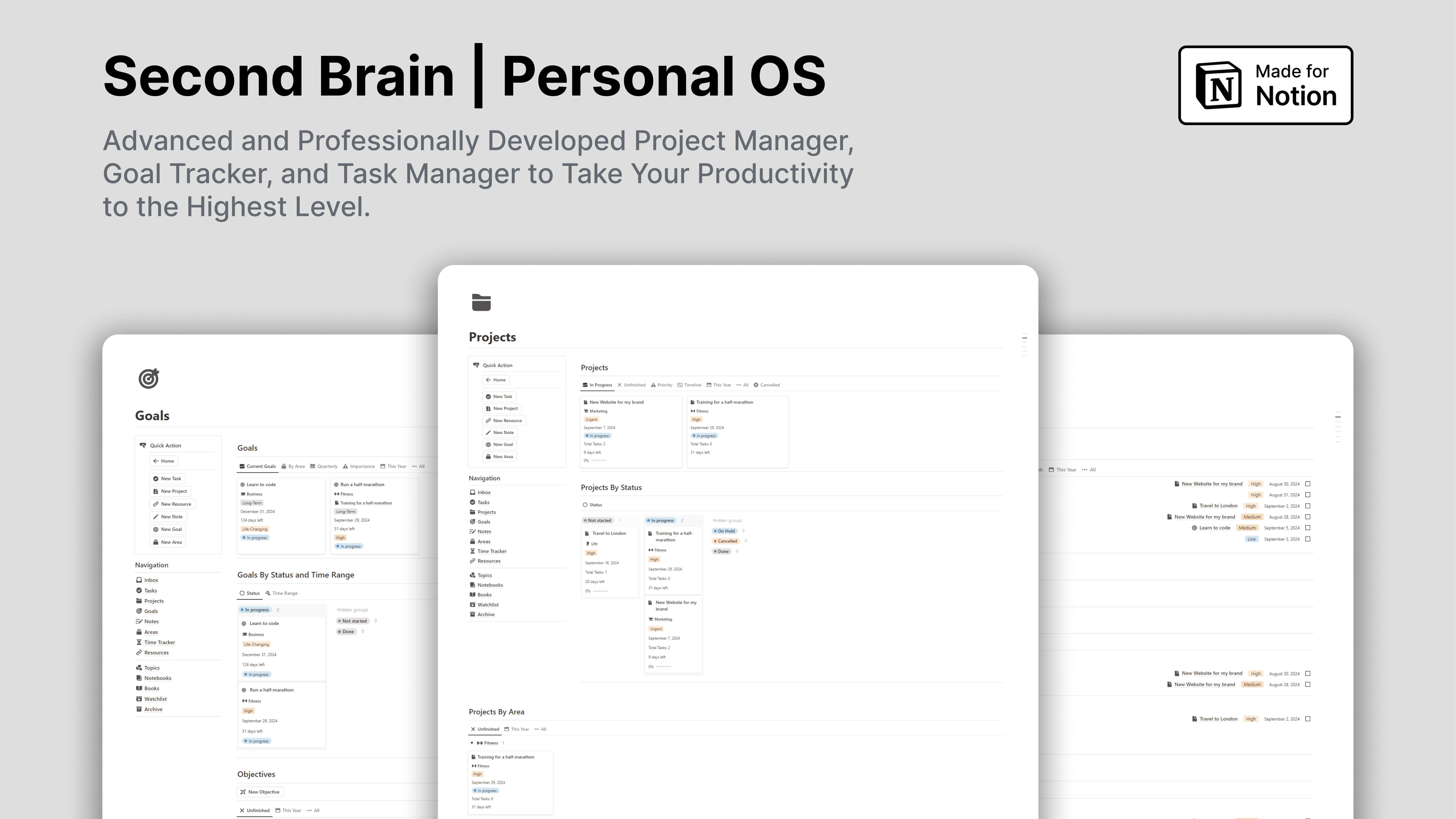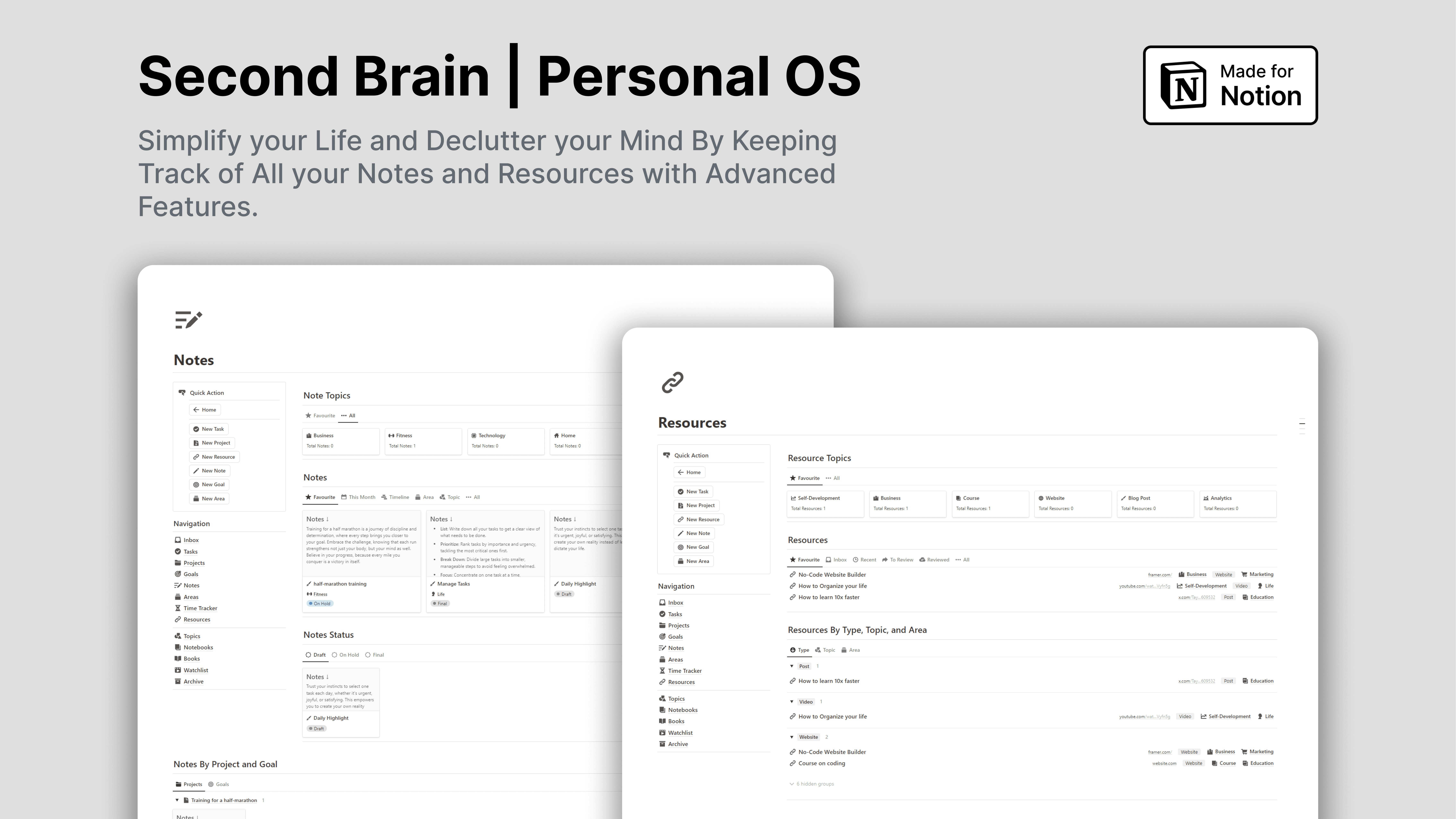 Manage and organize all your tasks, projects, goals, notes, resources, notebooks, books, and watchlists. Categorize everything by area or topic. As a bonus, you will get a time tracker to track the time spent working on projects or tasks; you can easily work with focus and without distractions. Notion Second Brain - Personal OS is a perfectly and professionally developed Notion System to help you maximize your productivity and potential.