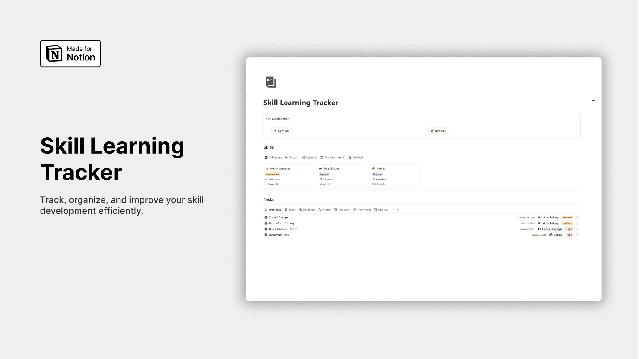 Looking to level up your skills? This Notion template helps you track exactly how you're progressing with any skill you want to master. Whether you're learning to code, picking up a new language, or mastering the guitar, you can break down your goals into manageable chunks and watch yourself improve over time.